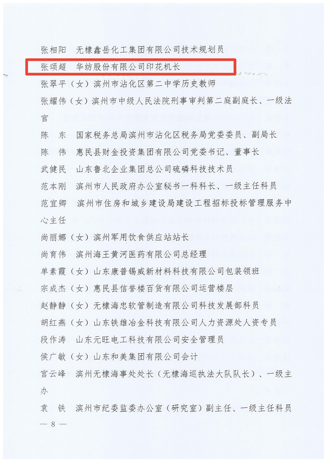 近日,濱州市總工會發(fā)布了“關(guān)于2023年濱州市五一勞動獎和濱州市工人先鋒號的通報”,對獲得濱州市五一勞動獎狀的無棣鑫岳燃化有限公司等26個單位,獲得濱州市五一勞動獎?wù)碌亩?90名個人,獲得濱州市工人先鋒號的濱州中裕食品有限公司面條三車間等30個集體予以通報表揚。其中,公司花布車間印花機機長張頌超榮獲2023年濱州市五一勞動獎?wù)隆?br />