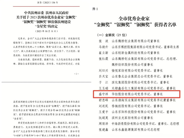 會上,對在品質濱州建設過程中作出突出貢獻的優秀企業家和先進單位進行了表彰頒獎,公司黨委書記、董事長盛守祥先生榮獲2023濱州市優秀企業家“金獅獎”。
